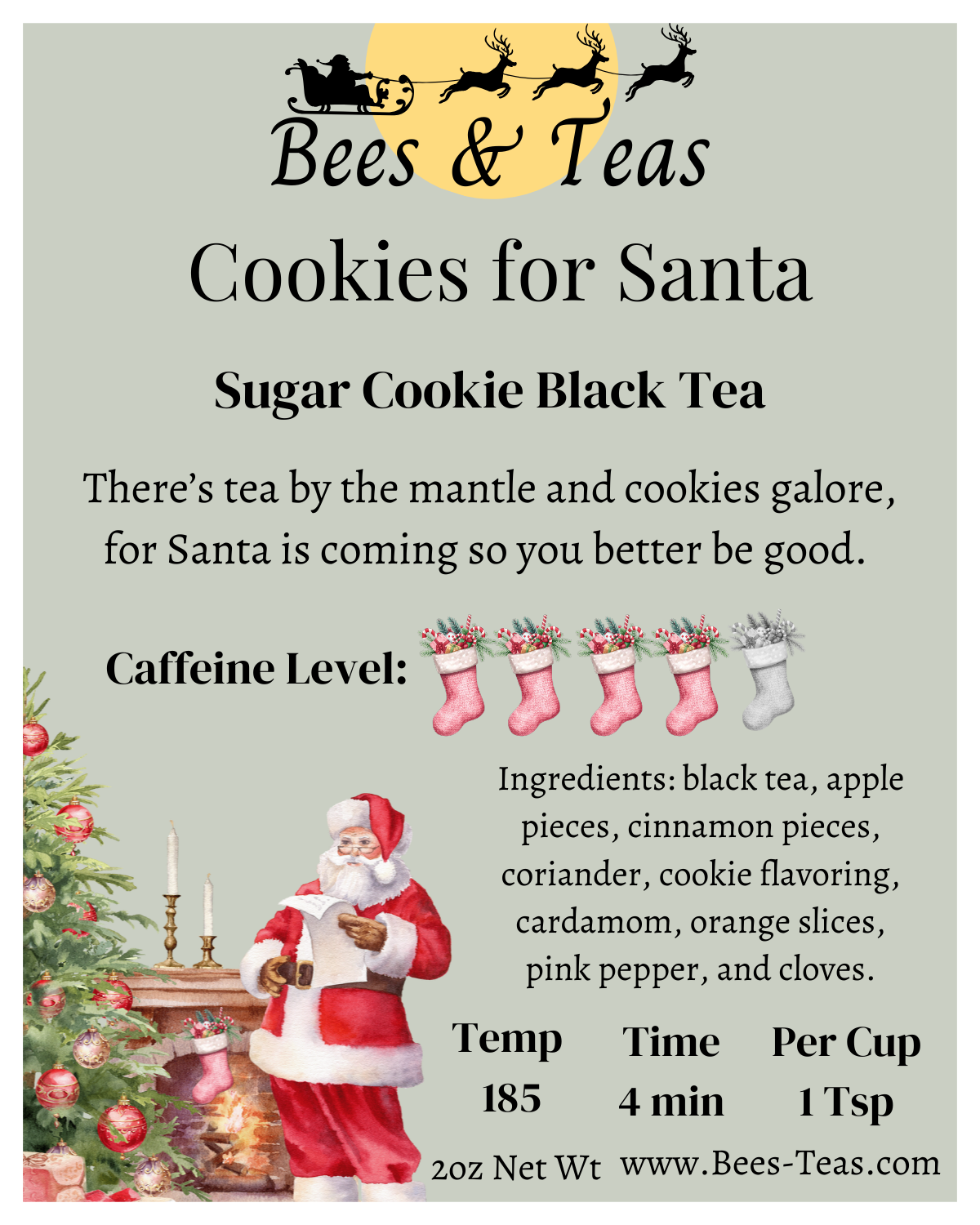 Ingredients: black tea, apple pieces, cinnamon pieces, coriander, cookie flavoring, cardamom, orange slices, pink pepper, and cloves.